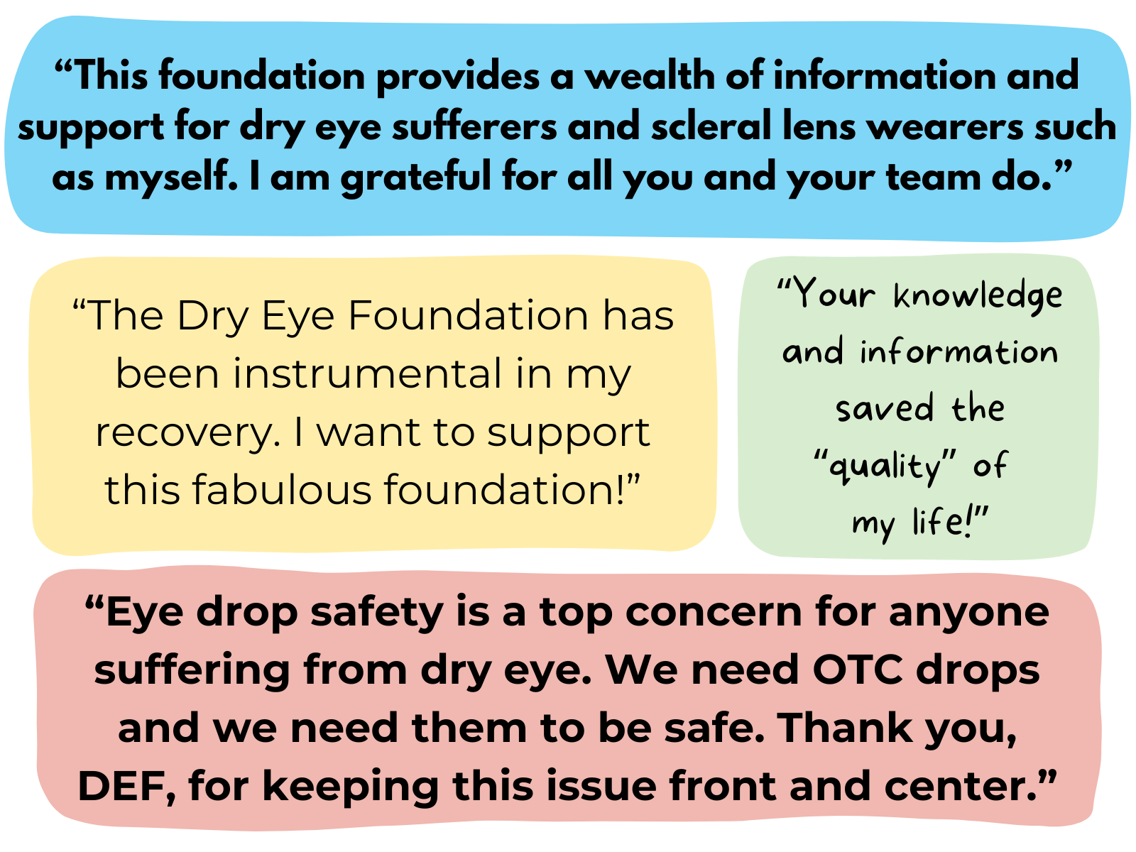 “Eye drop safety is a top concern for anyone suffering from dry eye. We need OTC drops and we need them to be safe. Thank you, DEF, for keeping this issue front and center.” -Susan